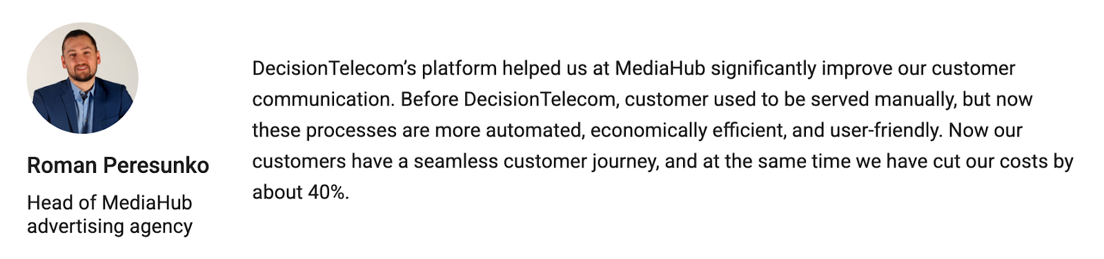 DecisionTelecom is a good fit for organizations that need more advanced features after outgrowing basic SMS tools. The dashboard is easy to use and shows campaign results in real time. The API connects easily with your CRM and other business apps. You can manage messaging across channels like Viber, WhatsApp, RCS, and Voice, all from one place.