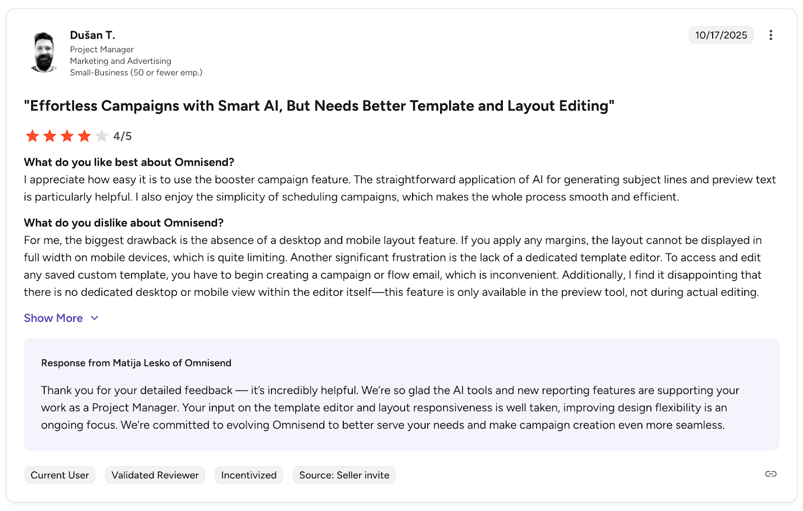 Integration gap and basic analytics: Many teams want more built-in integrations, like with Cvent or Salesforce, and better reporting tools. The current analytics are too simple to track trends or measure campaign results, making it hard to optimize or show value.